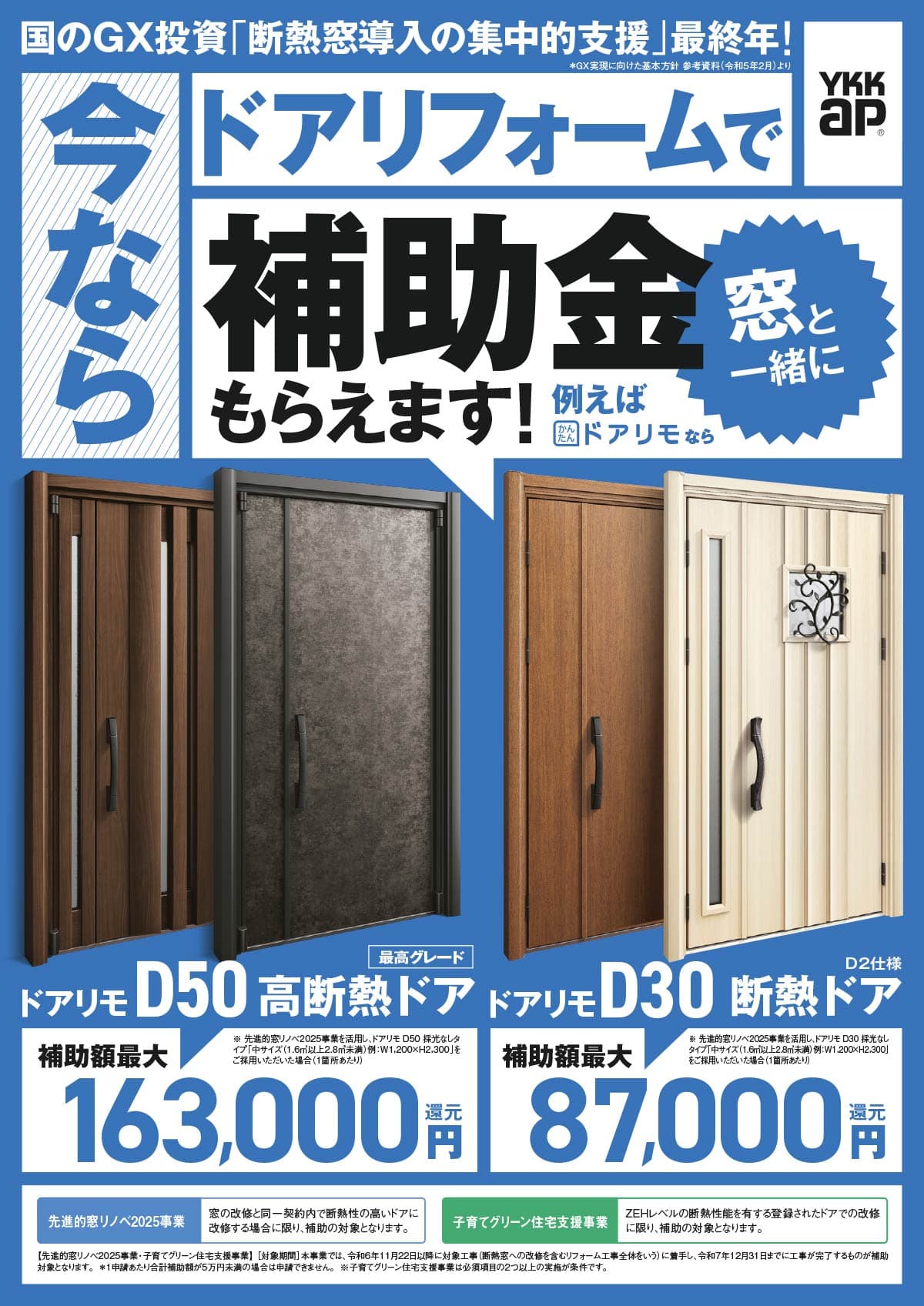 | 補助対象 | 高い断熱性能を持つ窓への改修に関する費用の1/2相当等を定額補助(上限200万円) また、2025年度より、窓の改修と同一契約内で断熱性能の高いドアに改修する場合に限り補助金の対象となりました。 |