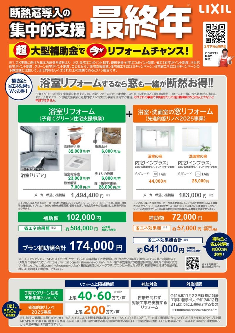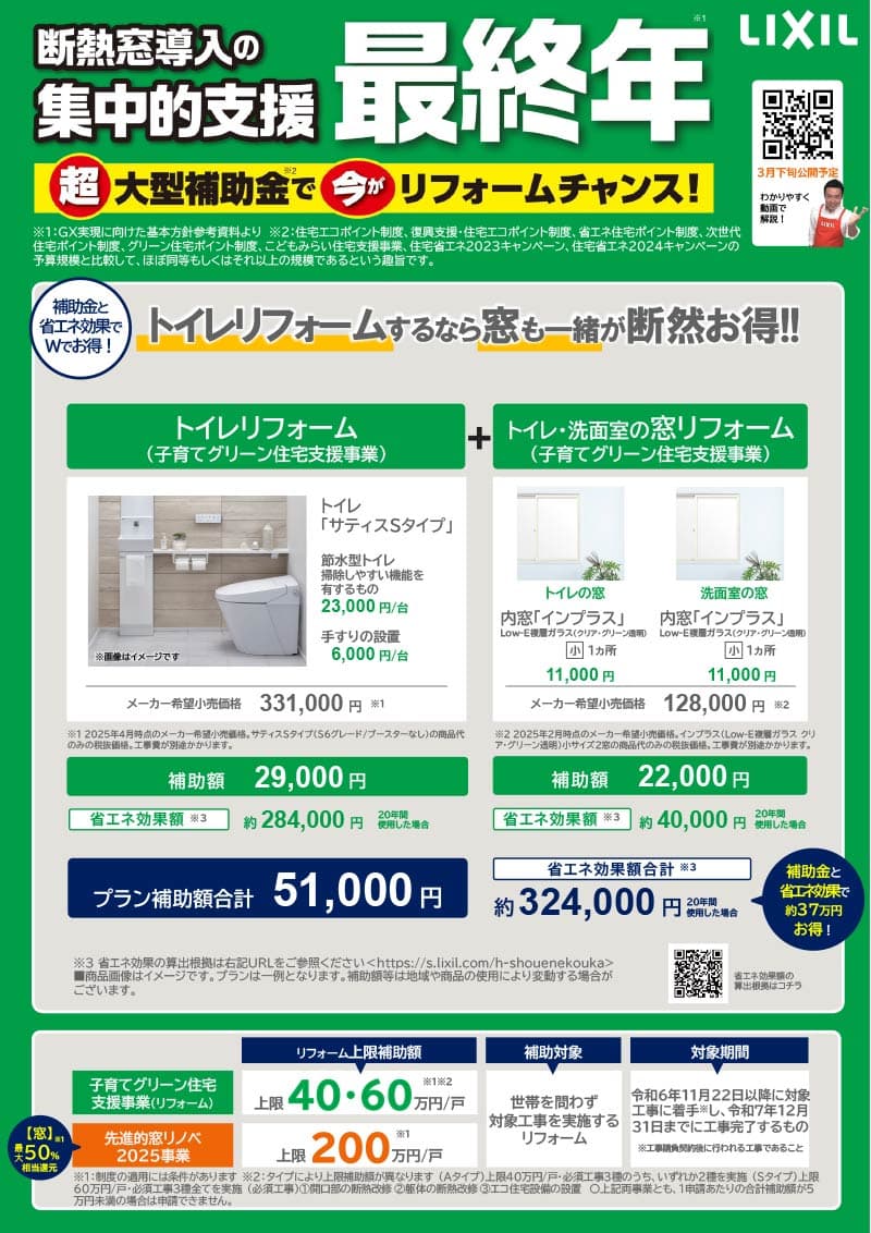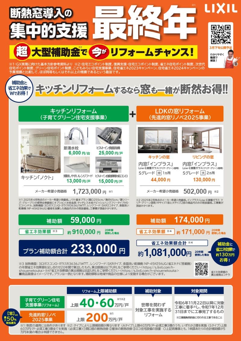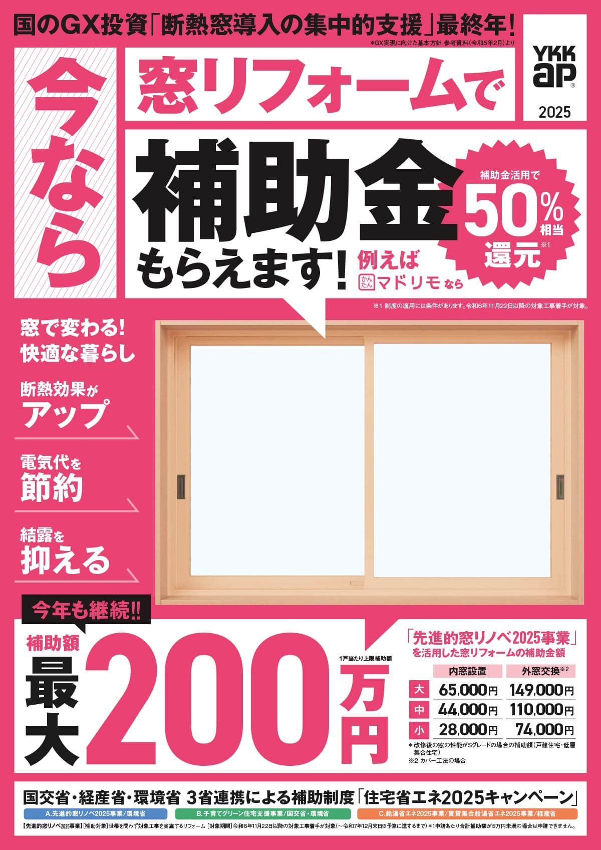 史上最大の補助金額!先進的窓リノベは今年度が最後の年となります。令和7年12月末までで予算枠がなくなり次第終了しますのでお急ぎご検討ください。