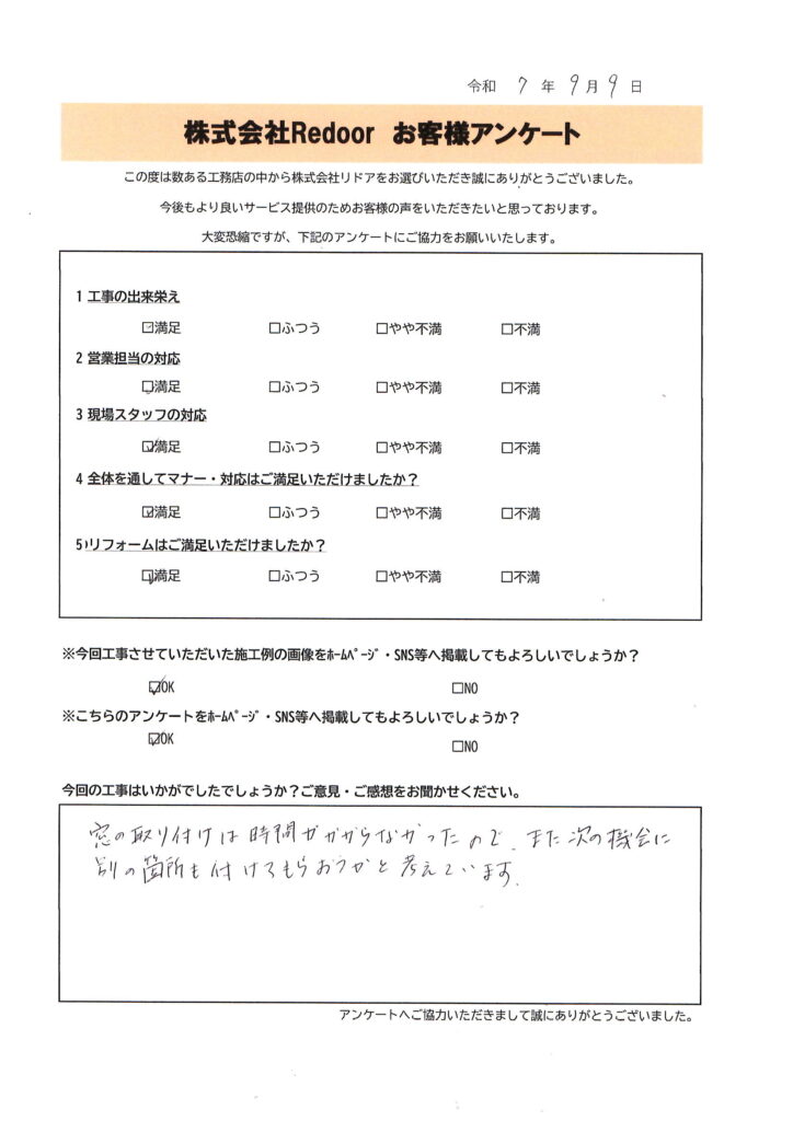 窓リフォームのご依頼、さらに追加の工事までお任せいただき、
