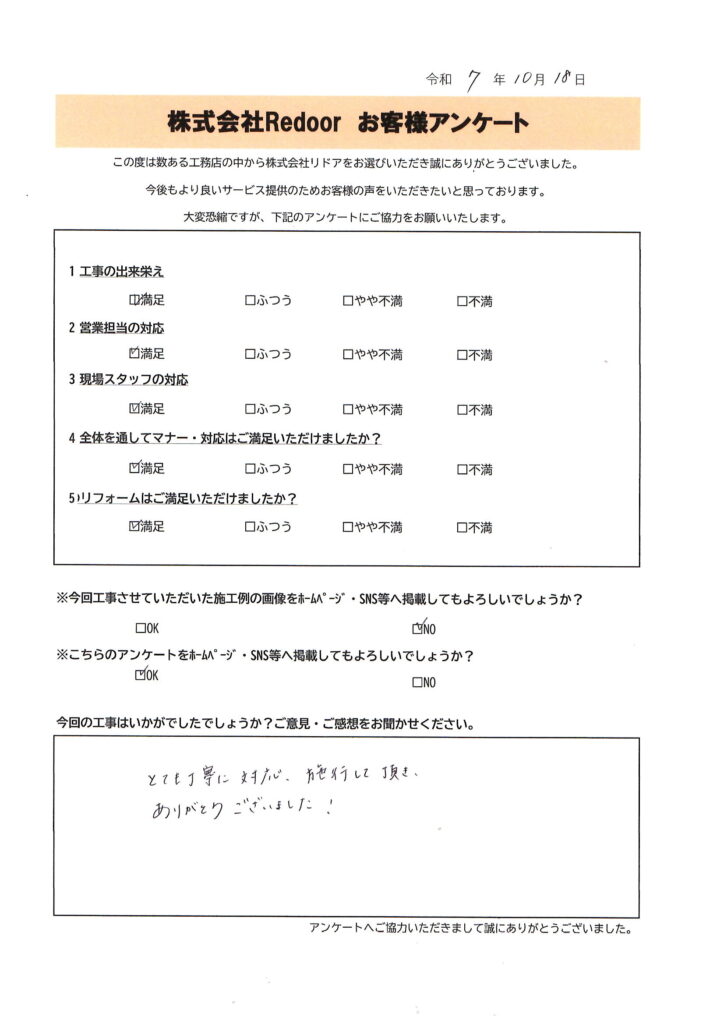 この度は、株式会社Redoorに工事をお任せいただき、誠にありがとうございました。